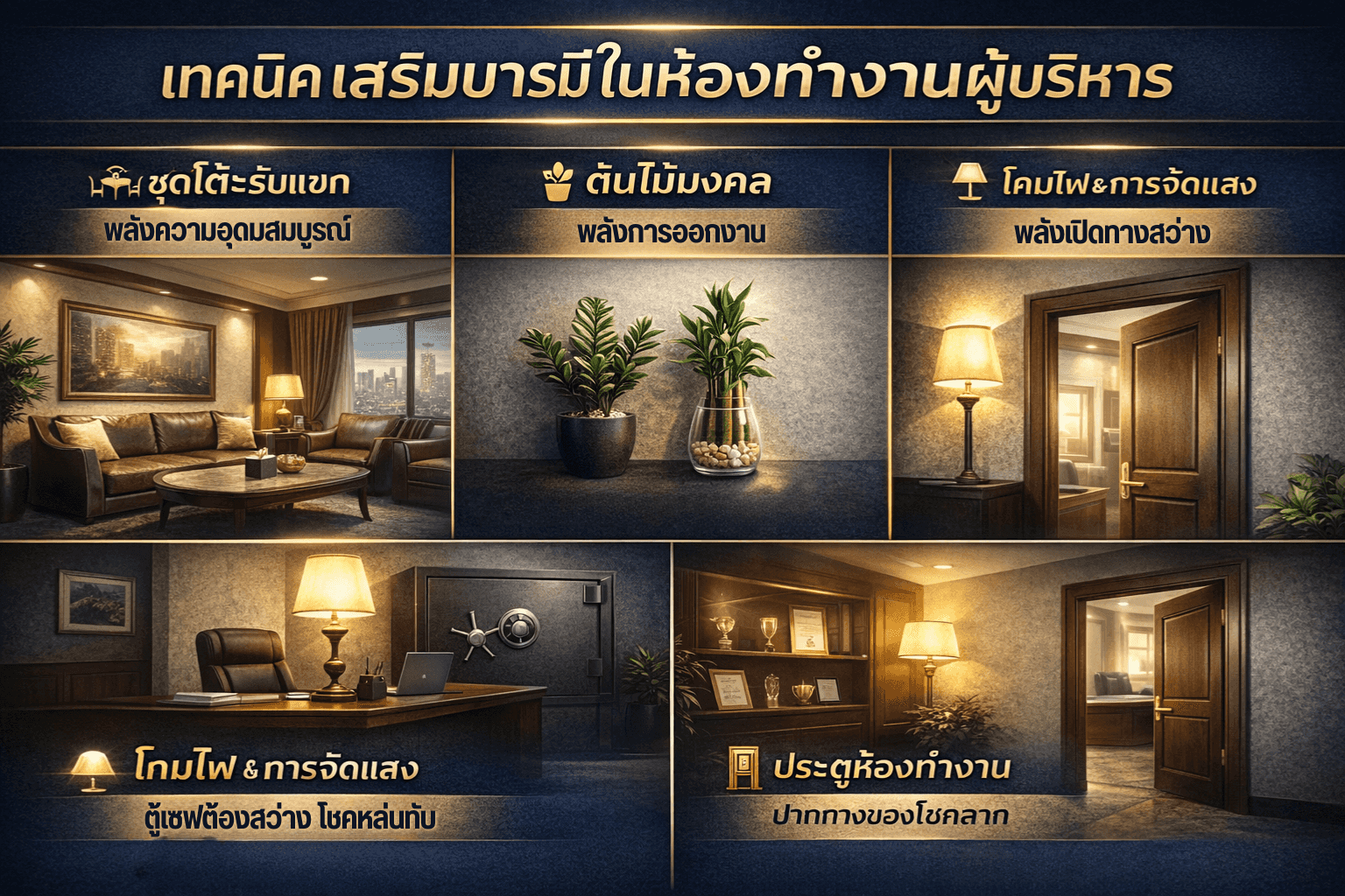 จุดที่ต้องเน้น: มุมโต๊ะทำงานและบริเวณตู้เซฟควรมีแสงสว่างที่เพียงพอ เพื่อให้พลังชี่ไหลเวียนได้ดี
