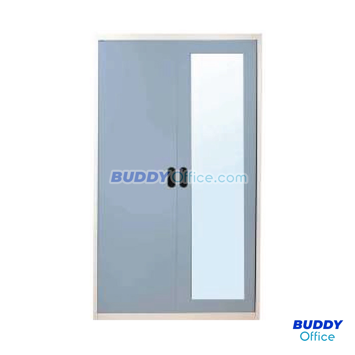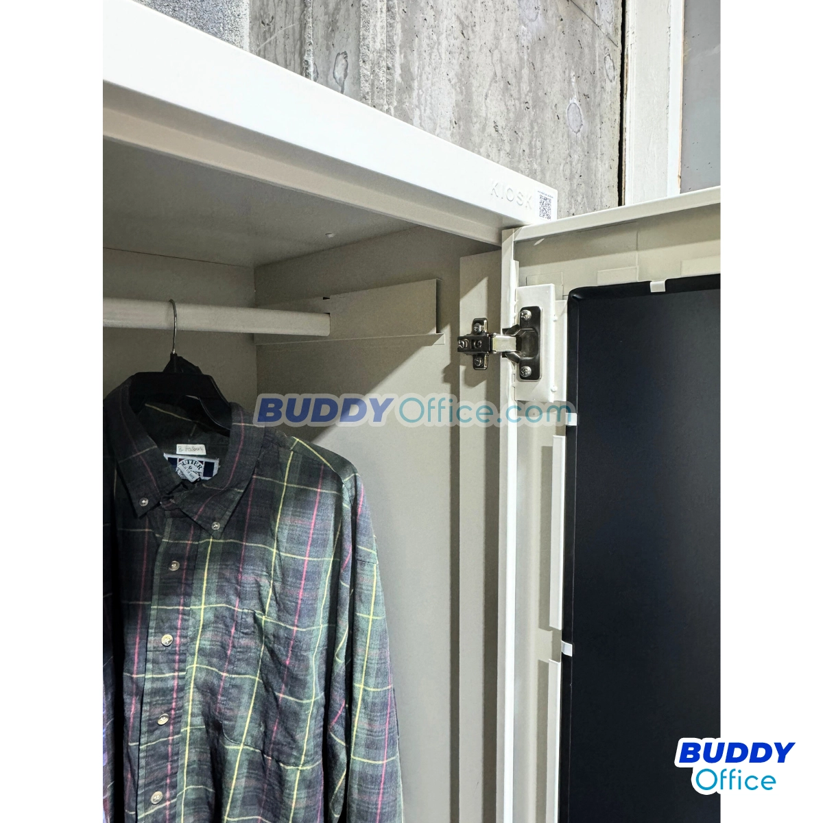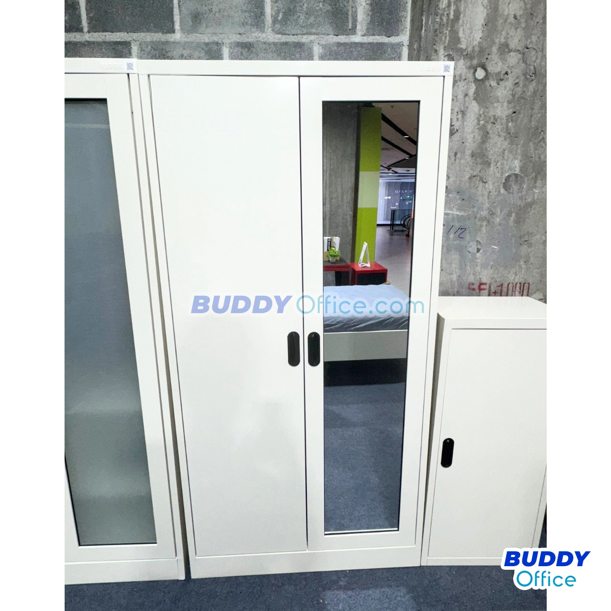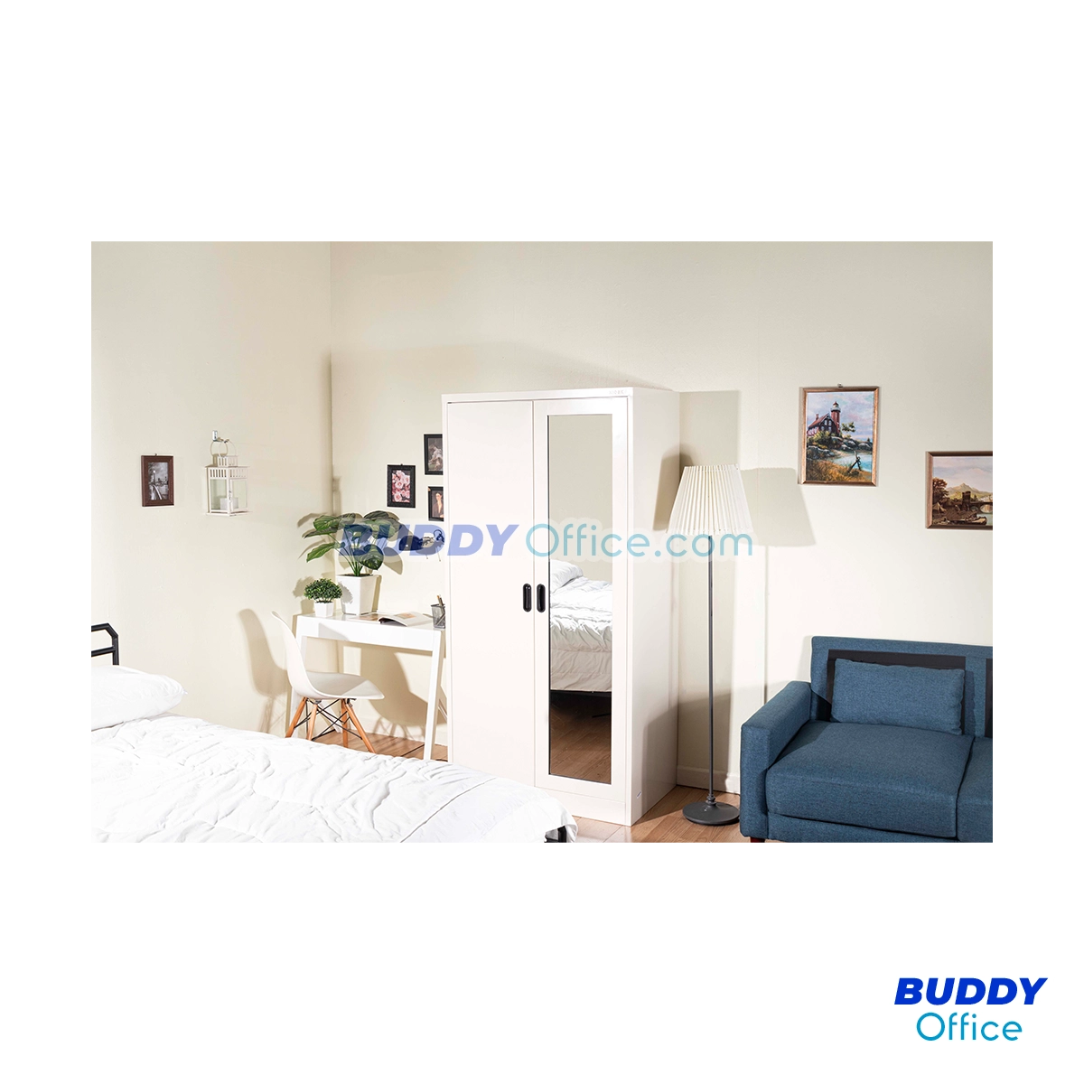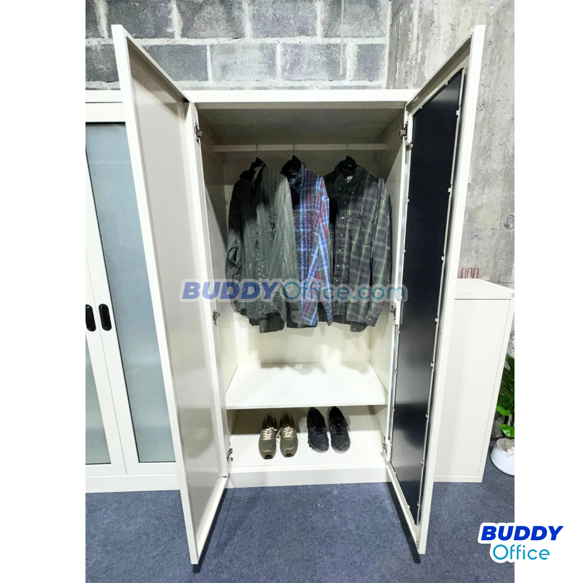 ◆ ตู้เสื้อผ้าเหล็กบานเลื่อนฝั่งซ้ายเป็นแบบบานทึบ ฝั่งขวาเป็นแบบกระจกเงาสำหรับส่องแต่งตัว