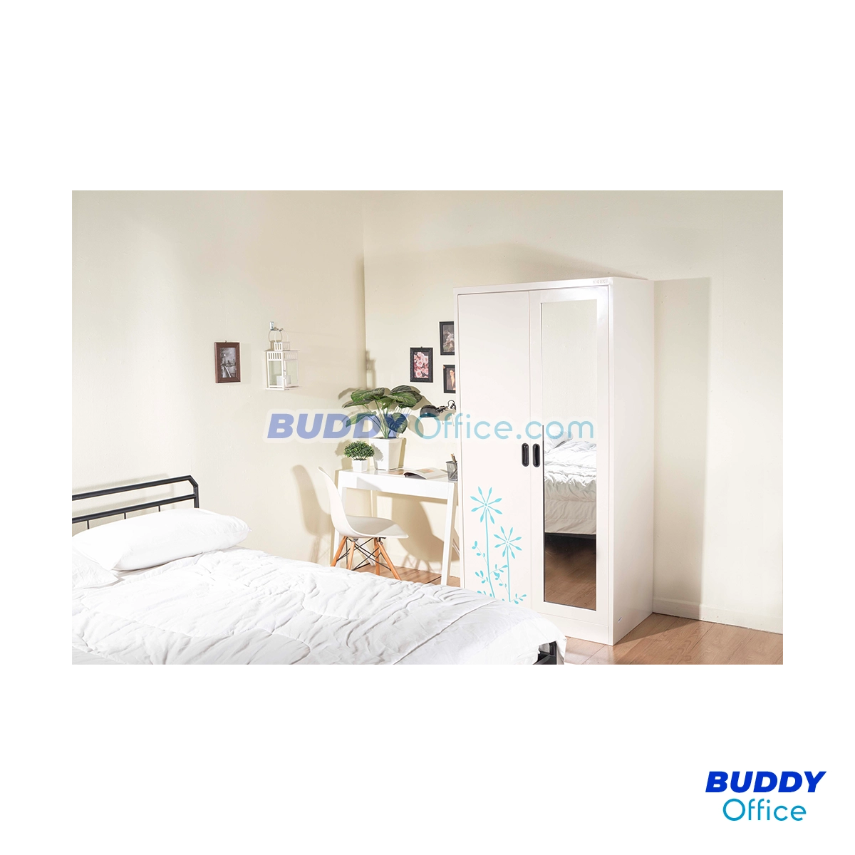 ◆ ตู้เสื้อผ้าเหล็กบานเลื่อนฝั่งซ้ายเป็นแบบบานทึบ ฝั่งขวาเป็นแบบกระจกเงาสำหรับส่องแต่งตัว