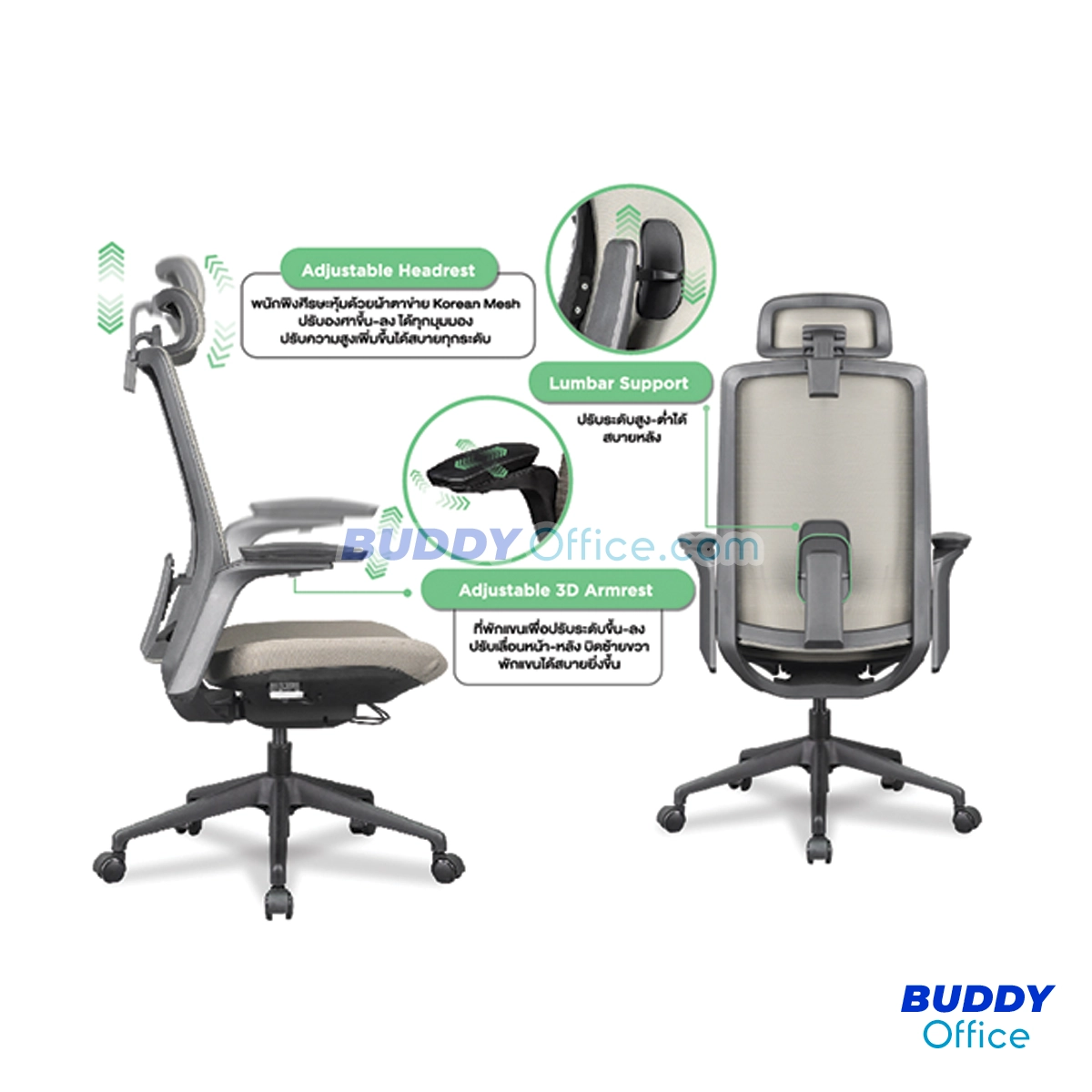 ◆ พนักพิงมี Lumbar Support พนักพิงมี Lumbar Support รองรับหลังปรับขึ้น-ลงได้ ปรับได้ 4 ระดับ