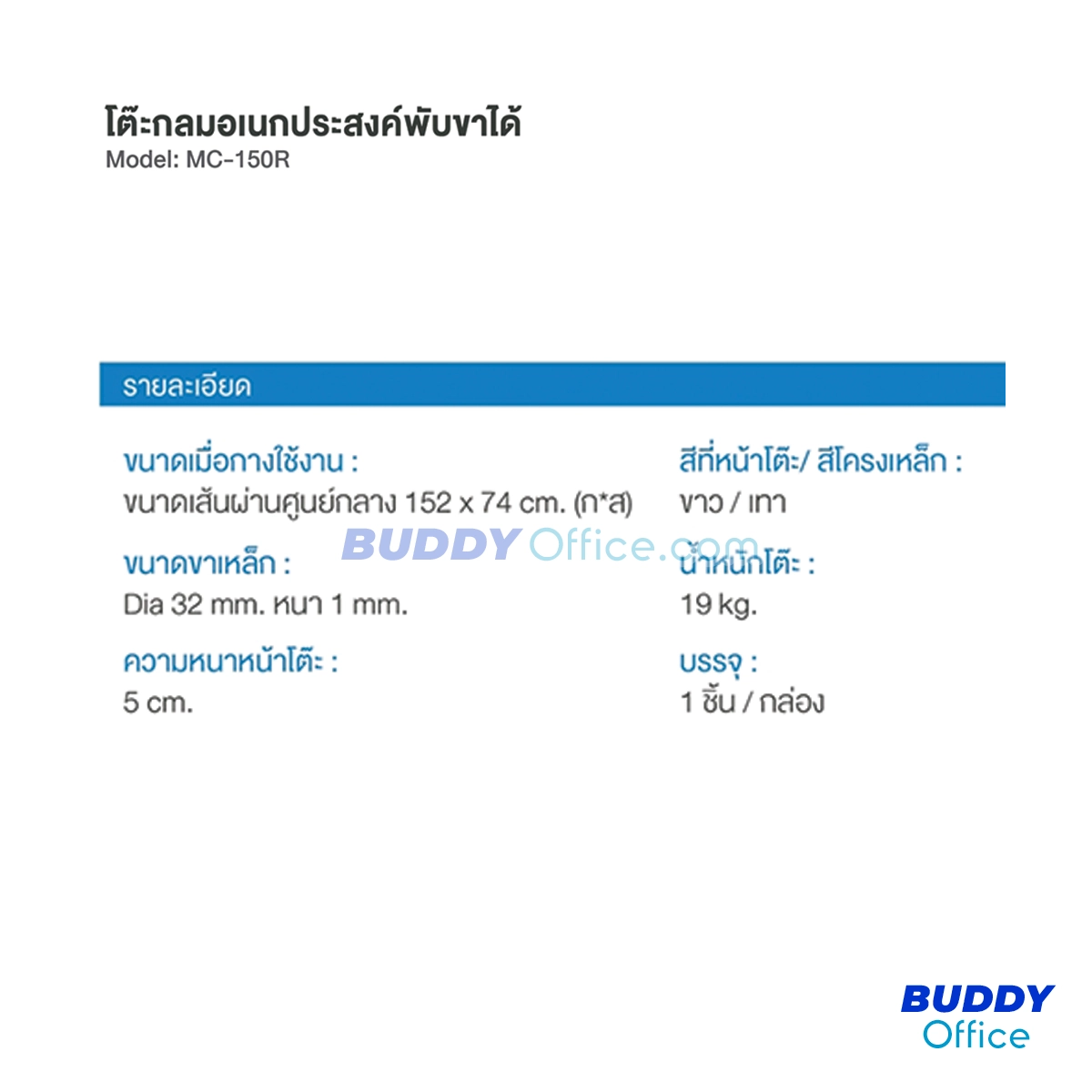 ◆ หน้าโต๊ะสีขาวและโครงเหล็กสีเทา หน้าโต๊ะหนา 5 ซม. น้ำหนัก 19 กก. สามารถพับเก็บได้