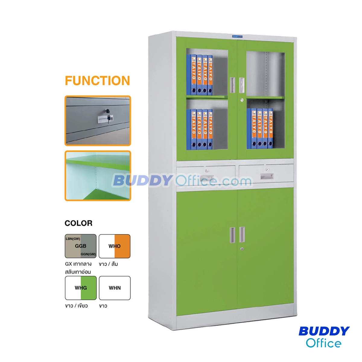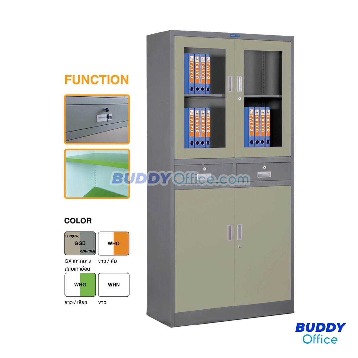◆ ด้านบนตู้บานเปิดกระจก ตรงกลางมี 2 ลิ้นชัก ด้านล่างบานเปิดทึบ ทั้งหมด มีกุญแจล็อค