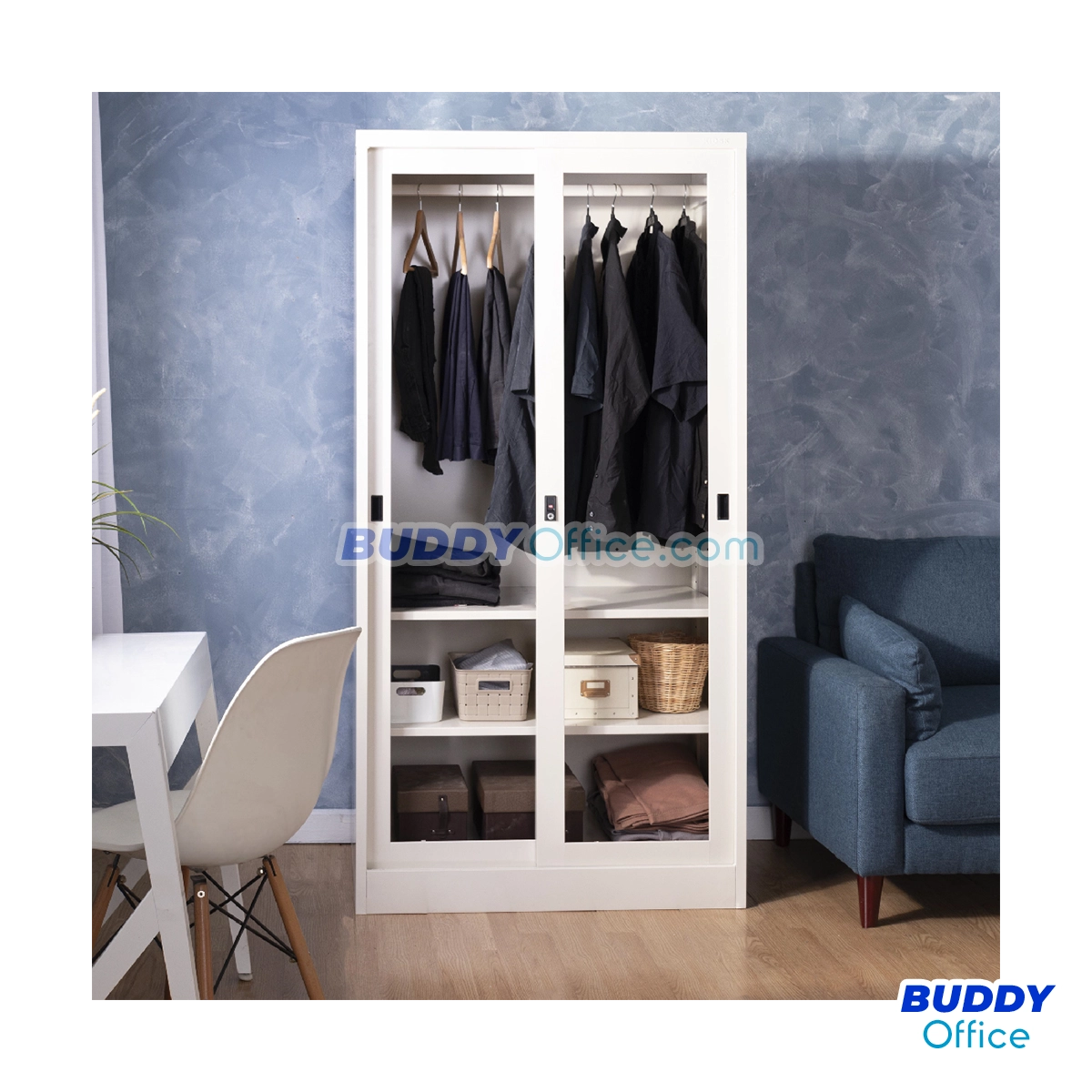 ตู้เสื้อผ้าเหล็กบานเลื่อน SGW181-1 กระจกฝ้า / ขนาด W91.4 x D56 x H182 ซม.